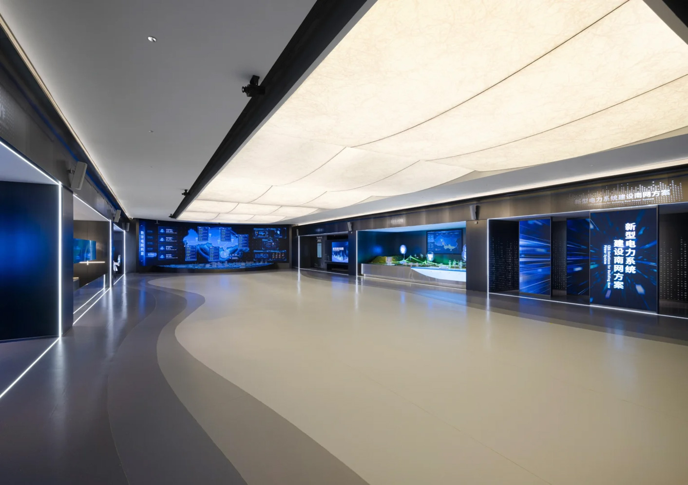 主展区沿墙面布置数字展项,融合层叠巨浪的造型,形成通厅式布局,弱化参观动线限制。内浅外深的配色既平衡了数字展项的冷峻感,又营造出会客厅般的舒适氛围。